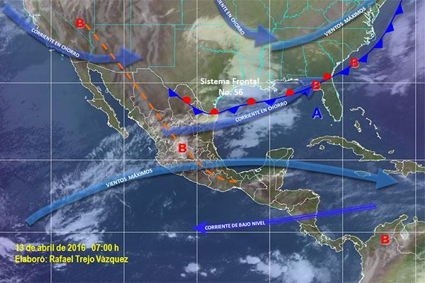 En su pronóstico del estado general del tiempo en el paÃs el SMN refirió que el frente frÃo número 56 se extenderá este dÃa desde la costa oriental de Estados Unidos de América hasta Tamaulipas y el noreste del paÃs. Este sistema propiciará precipitaciones fuertes en Tamaulipas, y lluvi...
