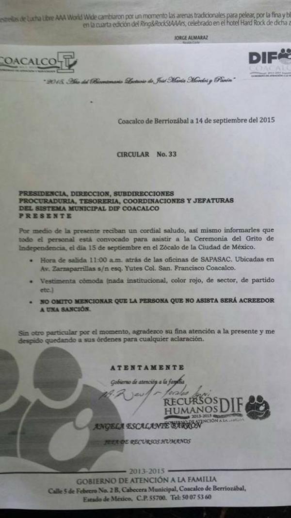 Circula en redes sociales un documento presuntamente emitido por el gobierno municipal de Coacalco, en el Estado de México, donde se invita a los trabajadores del Ayuntamiento a acudir esta noche a la ceremonia del Grito de Independencia que dará el Presidente Enrique Peña Nieto desde Palacio...