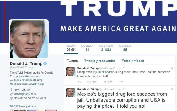 En su cuenta de Twitter el multimillonario Donald Trump escribió un mensaje donde hace mención de la fuga de El Chapo Guzmán. En el mensaje escrito por Trump dice “El mayor señor de las drogas de México escapa de la cárcel. IncreÃble corrupción y EEUU está pagando el precio, se los dije...
