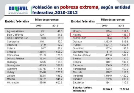 Al cierre del año 2012, Nayarit registró un aumento en su población en situación de pobreza extrema, pasando de 92.7 miles de personas en 2010 a 138.7 miles de personas al final del año pasado, según reveló el Consejo Nacional de Evaluación de la PolÃtica de Desarrollo Social (Coneval), est...
