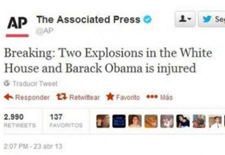 La cuenta en Twitter de la agencia de noticias estadounidense Associated Press (AP) fue hackeada esta tarde. Durante unos segundos y se pudo leer un tuit que alertaba de "dos explosiones en la Casa Blanca" en las que había resultado "herido el presidente de EE.UU., Barack Obama", lo cual fue des...