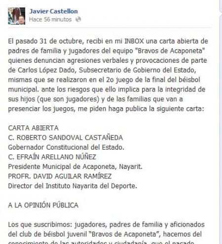 Esta tarde, el ex Senador de la República, Javier Castellón Fonseca, hizo público a través de su espacio en FB: El pasado 31 de octubre, recibi en mi INBOX una carta abierta de padres de familia y jugadores del equipo "Bravos de Acaponeta" quienes denuncian agresiones verbales y provocaciones...