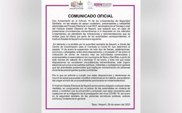 El Consejo Local del Instituto Estatal Electoral de Nayarit (IEEN), informa a los partidos políticos, militantes y ciudadanía en general que quedan prohibidas las actividades presenciales que impliquen concentración de personas durante las precampañas. Lo anterior fue informado a través de u...